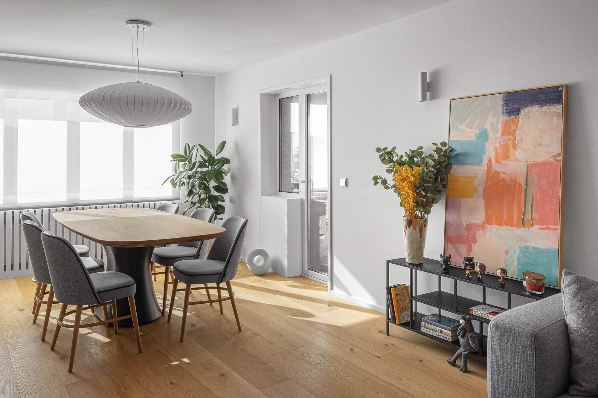 Los propietarios nos planteaban un programa postpandémico, dónde querían que hubiera una buena zona de trabajo dentro de la vivienda, independiente, con buena luz y silencioso; un dormitorio con vestidor y baño privativo y una cocina con mucho almacenaje con zona informal para comer, todo ello unido visualmente con el salón y mesa de juegos.