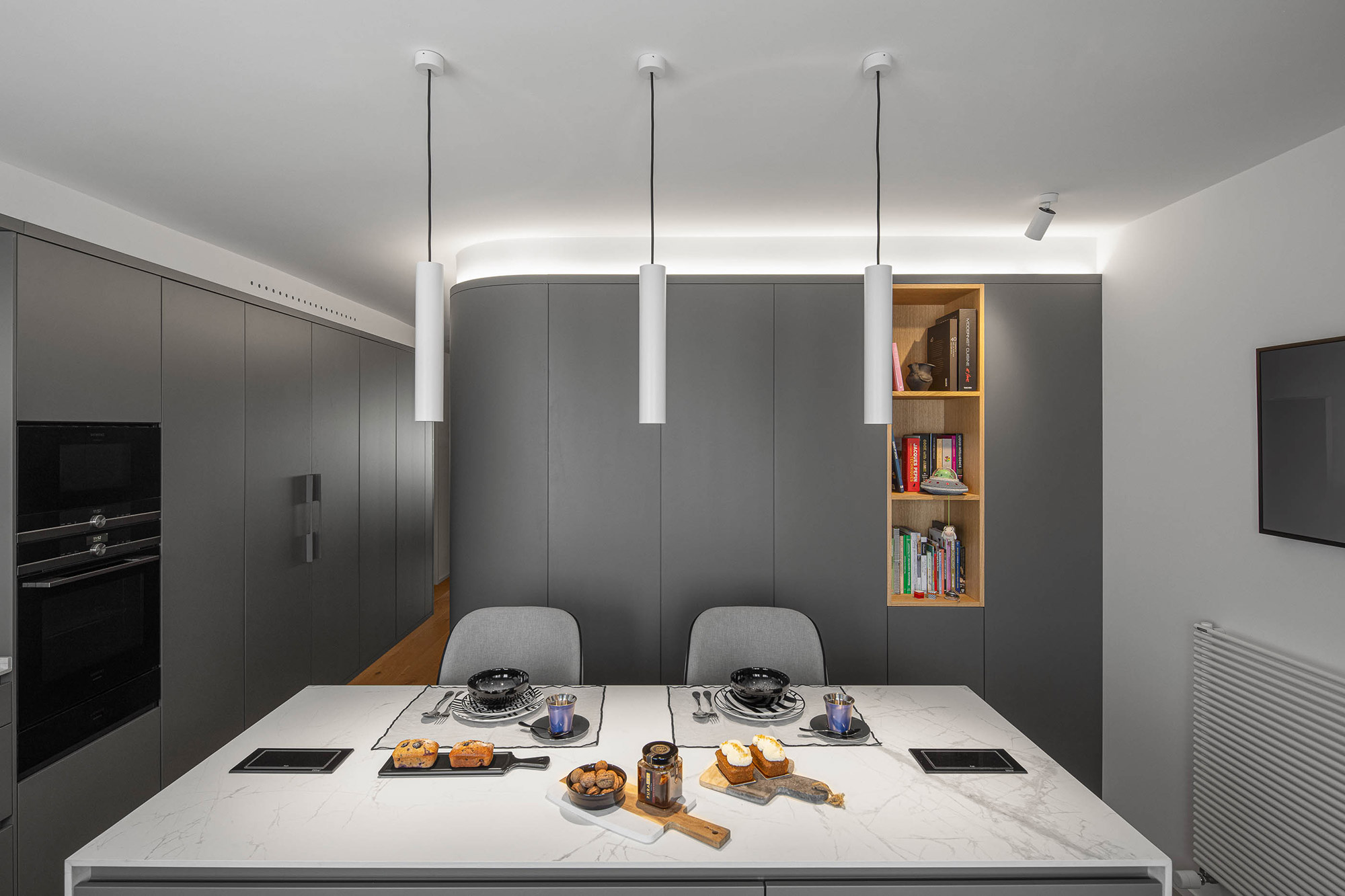 En esta intervención se busca que la unión entre los distintos espacios sea lo más conectada posible pero sin caer en el espacio desproporcionado y desangelado, por ello la utilización del mobiliario curvo, actúa como regulador de los espacios de manera suave y fluida. Como hacemos en otras ocasiones todo el mobiliario está precedido de una falsa viga superior que servirá de elemento para el paso de instalaciones sin tener que reducir así las alturas de los espacios vivideros. Por último predomina el color blanco de las paredes en contraste con las estanterías de madera a veces abiertas por los dos lados y el color gris visón que actúa de unificador de todo el conjunto.